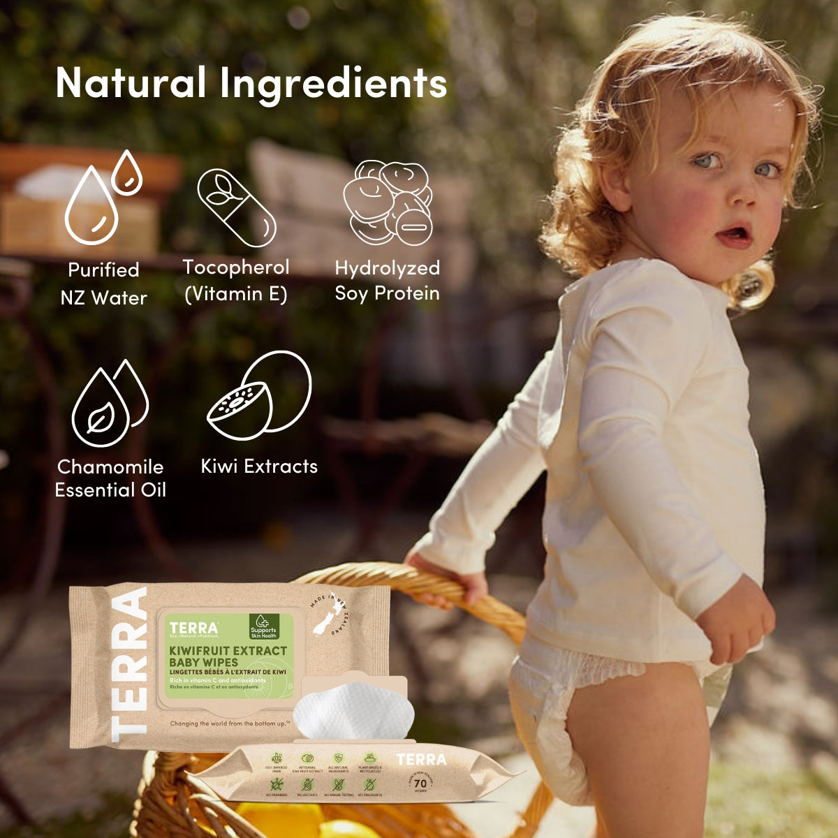 Made with Natural Kiwifruit extract and 99% Pure New Zealand Water, Terra Kiwifruit Wipes are designed to refresh, soothe, and nourish your baby’s sensitive skin.