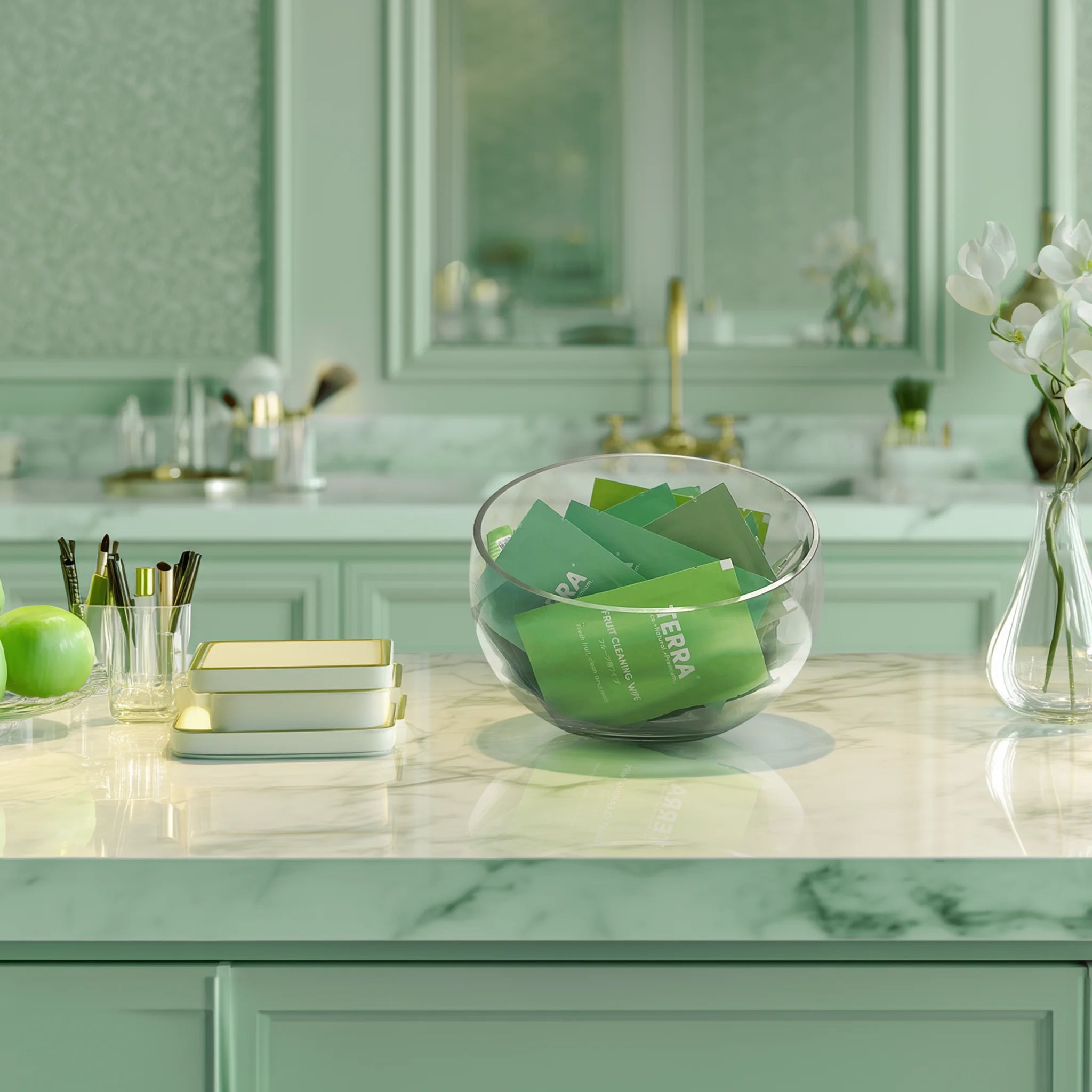 The Terra Essence Bowl is crafted for those who believe that true luxury lies in thoughtful simplicity. Designed to hold up to 200 TERRA wipe sachets, it elevates an everyday essential into a beautifully curated experience. With its crystal-clear finish and smooth, sculpted contours, the bowl seamlessly blends into modern homes, enhancing the aesthetic of any space.